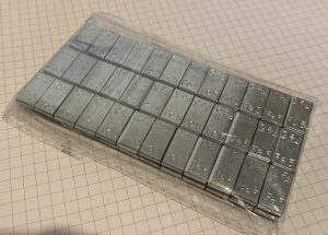 The depth of the box had to be sufficient to allow for a comfortable height to hold the key knob when sending. I thought 35mm height would be OK. It also would allow me to fix mini weights into the base to give it better stability, and I decided that Motorcycle wheel weights would be perfect and purchased the following from Amazon (see below). These had self-adhesive backing so would be easy to fix in the base. Each strip is about 135 x 20mm and six strips would give me about 12.6 oz (350g) dead weight, which should stop it drifting around the table when in use.